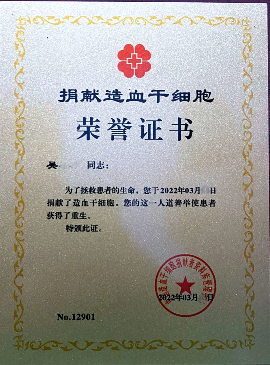 據(jù)悉,吳遷偉是全國(guó)第12901個(gè)造血干細(xì)胞捐獻(xiàn)志愿者,是重慶市第166個(gè)。今后,世界上將會(huì)有另一個(gè)人跟他擁有一樣的血型,與他“血脈相連”。