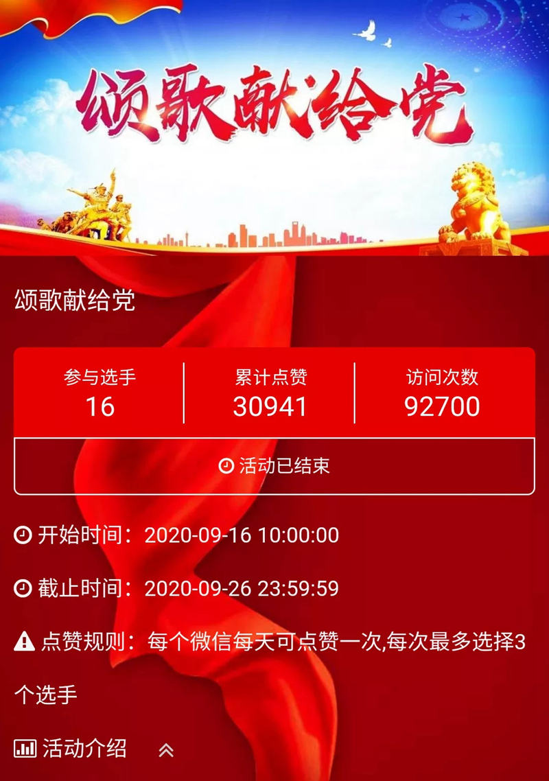 本次活動共收到參賽作品16個,其中團體作品7個,個人作品9個,共計35人參賽。從2020年9月16日到9月27日,活動通過大眾點贊投票的方式,進行了11天的網(wǎng)上音頻展播。獲獎情況如下: