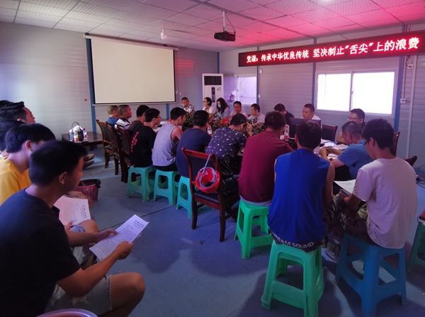 課堂上,冉軍按照習(xí)總書記關(guān)于“堅(jiān)決制止餐飲浪費(fèi)行為切實(shí)培養(yǎng)節(jié)約習(xí)慣,在全社會(huì)營(yíng)造浪費(fèi)可恥,節(jié)約為榮的氛圍”的重要指示精神,從餐飲浪費(fèi)的現(xiàn)狀分析講述了制止“舌尖”上的浪費(fèi)必要性、緊迫性。要求全體與會(huì)人員要切實(shí)從自身做起,培養(yǎng)節(jié)約習(xí)慣,在項(xiàng)目上營(yíng)造浪費(fèi)可恥、節(jié)約為榮的良好氛圍。項(xiàng)目部常務(wù)副經(jīng)理代洪果則結(jié)合生產(chǎn)實(shí)際,從工作中一張A4紙、一顆螺絲釘、一個(gè)扣件、一根鋼管的節(jié)約與管理要求全體職工從思想上增強(qiáng)厲行節(jié)約的自覺性,從行為上要嚴(yán)格執(zhí)行堅(jiān)決制止浪費(fèi),尤其是餐飲浪費(fèi)的行為,營(yíng)造節(jié)約光榮的良好氛圍。