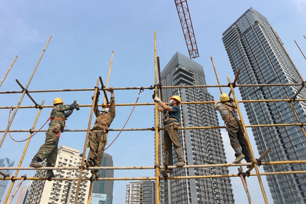 4月24日,住建公司水市巷項(xiàng)目建筑工人正在進(jìn)行外架加固