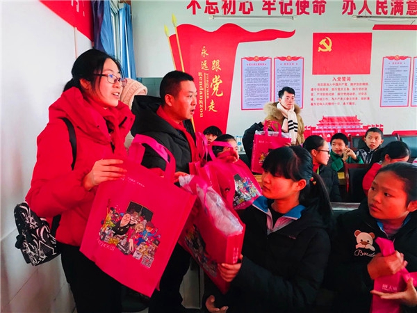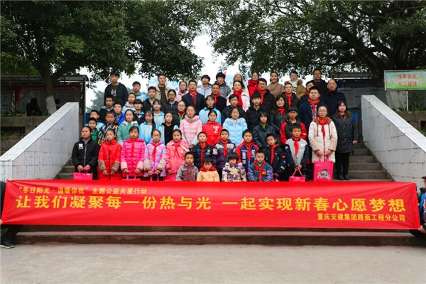 一群兒童拿到新書包、新衣服、新圖書后,興奮地圍在一起歡呼跳躍。1月15日,交建路面工程分公司工會成員攜帶一批文具和衣服到永川區(qū)五間鎮(zhèn)小學,進行“冬日陽光·溫暖你我”2019年新春主題公益關愛活動。